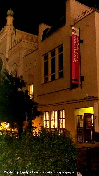 『Spanish Synagogue』-西班牙會堂是一座摩爾復興式的猶太會堂,立面模仿了奧地利維也納1853年興建的利奧波德城會堂,分為三部分,中間抬高,兩翼較低,中部的頂部設有一對圓頂角樓。二戰期間,德國人將這座建築改為奪取的猶太人財產的倉庫。1990年代後期進行了修復,這座建築由布拉格猶太博物館所有,用作博物館和音樂廳。(出自維基百科)