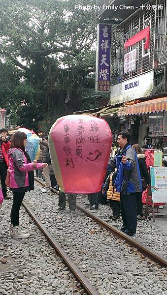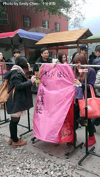 鐵道旁觀光客們在天燈上寫上祝福話語,