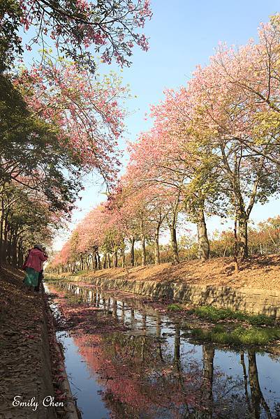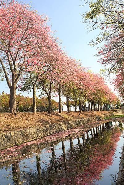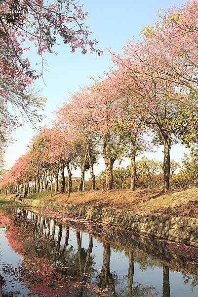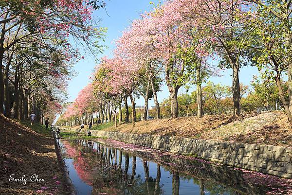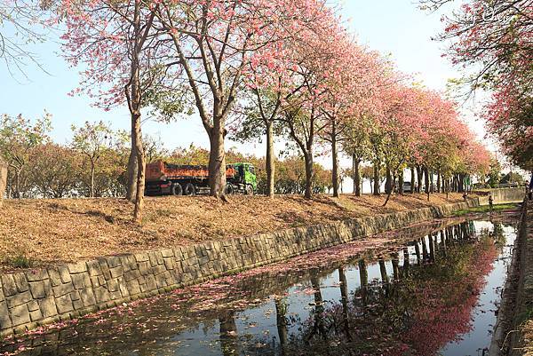 粉紅花開沿著河道盛開兩旁,