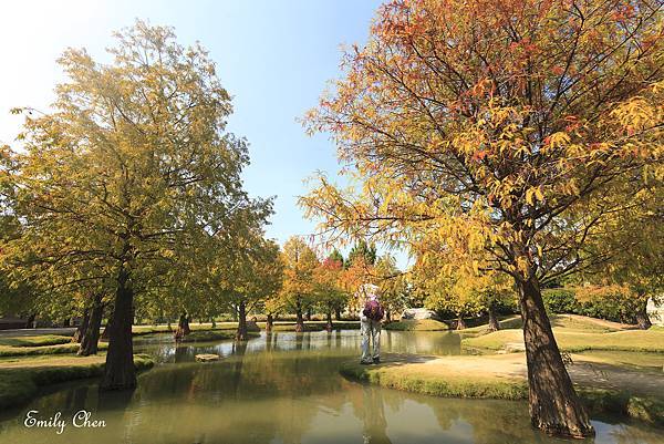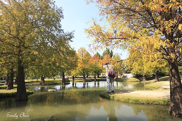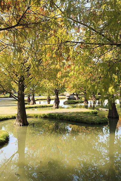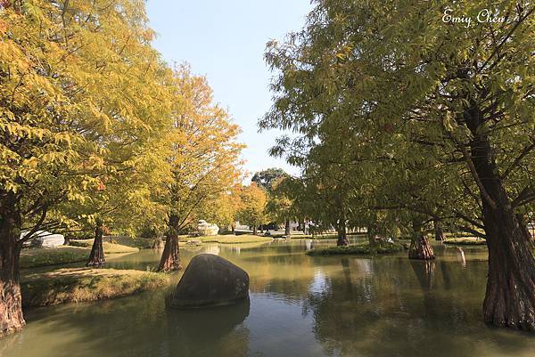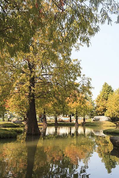 水池旁種植多顆落羽松,