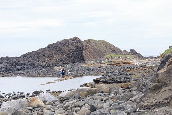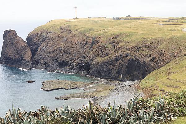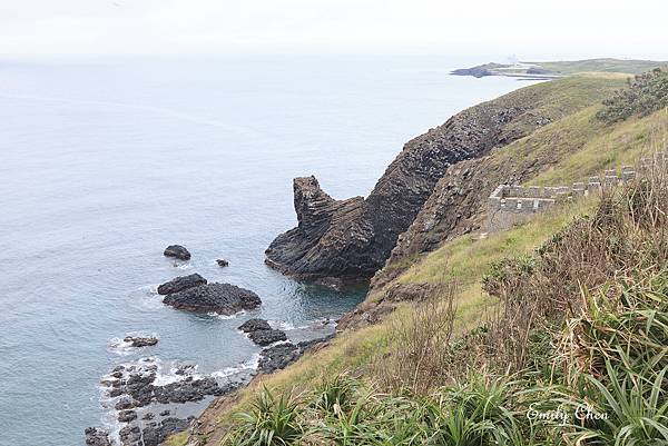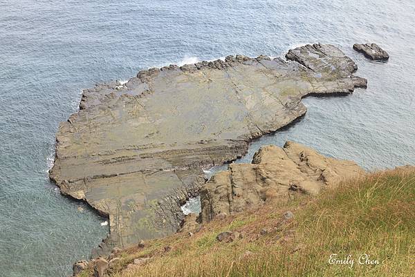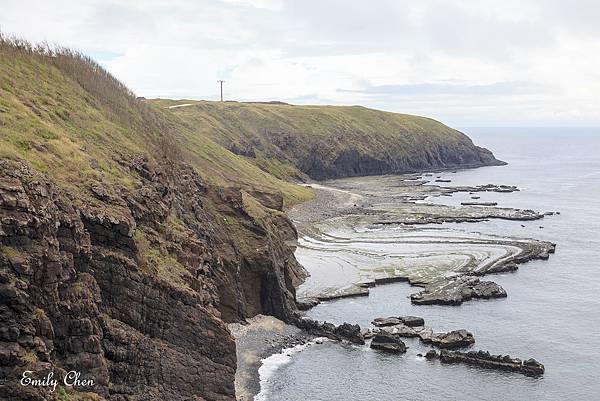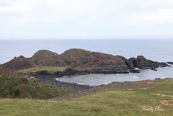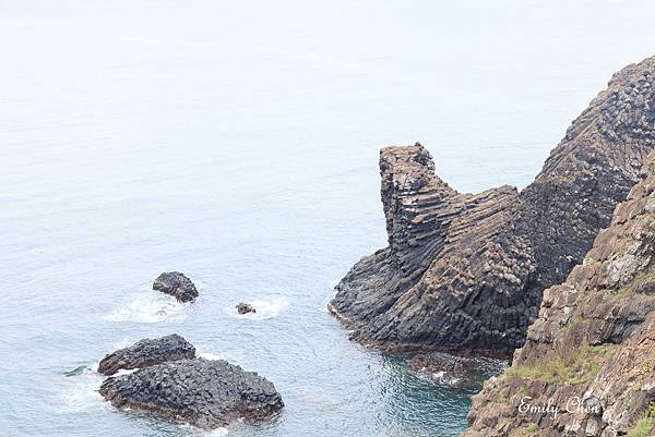前方凸出玄武岩神似石獅蹲立望向大海,