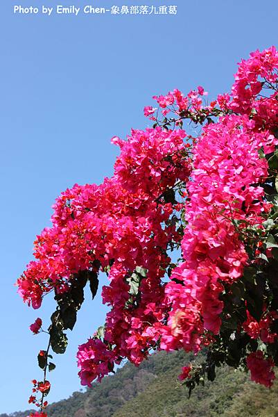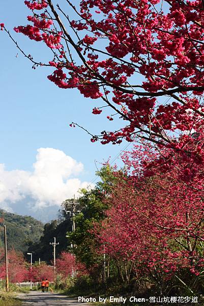 古道旁山櫻花、李花、九重葛等花兒盛開,
