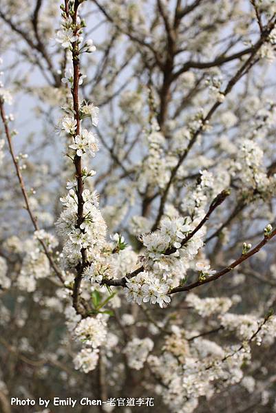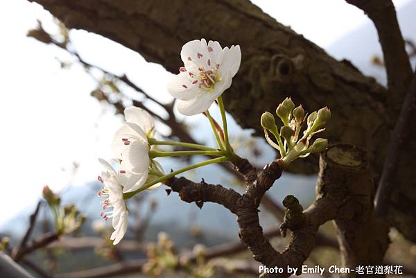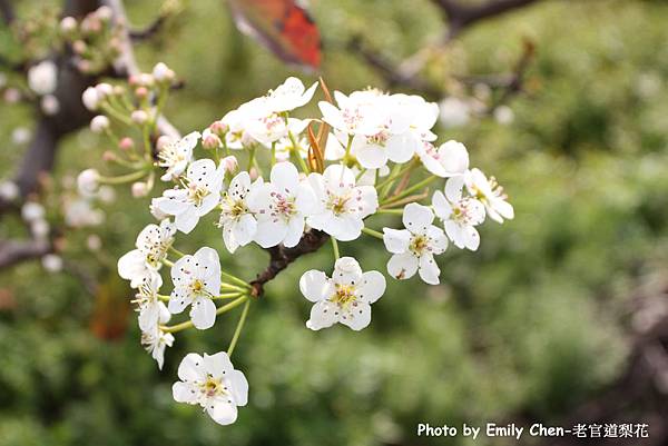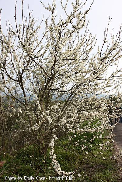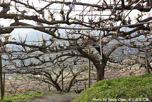 步道旁兩側栽植高接梨,初春時梨花處處盛開,美不勝收,