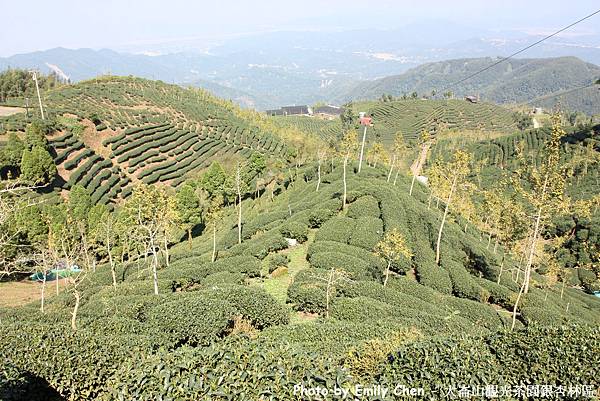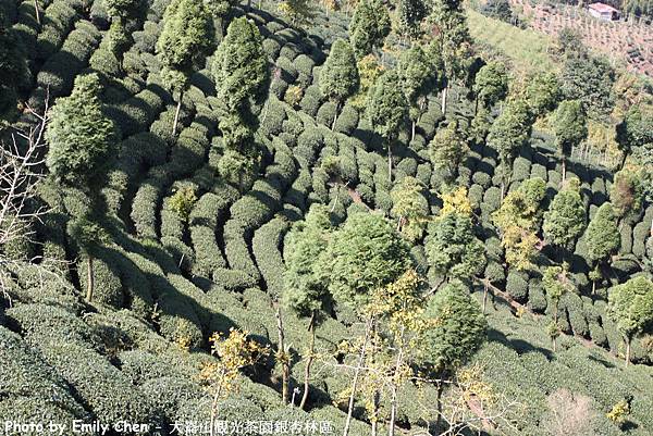 梯田整齊的排列在潭邊山麓,遍植烏龍茶樹,翠綠掩映,