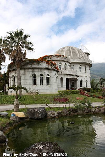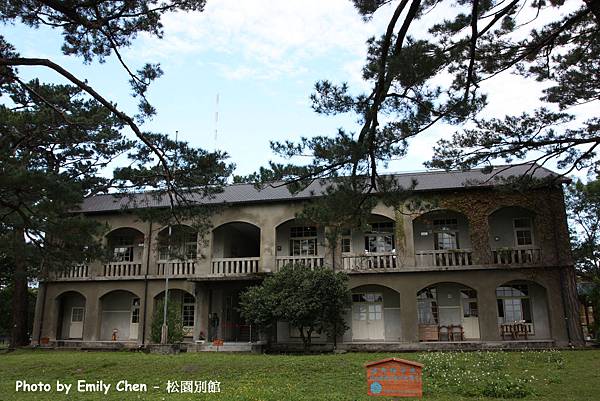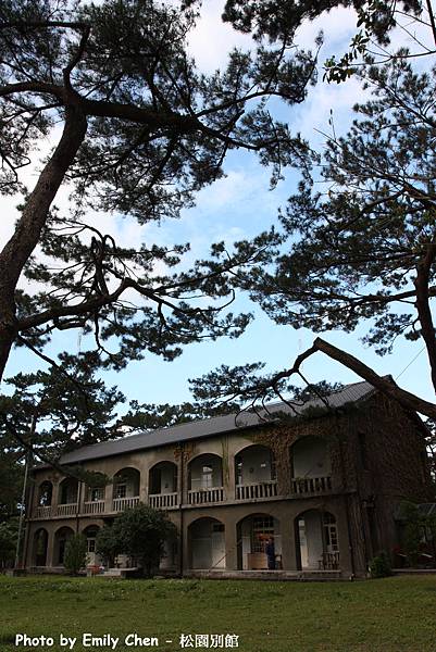 『松園別館』-花蓮縣僅存最完整的日據時代軍事建築物。主體建築為折衷主義形式的磚木、RC混合二層洋樓建築,一、二層樓皆設拱廊,日本瓦頂。前棟為坐西北向東南的二層樓房,軍事公務用途外兼具廚房、伙房、洗衣間、睡房等宿舍設施。(出自松園別館告示牌說明)