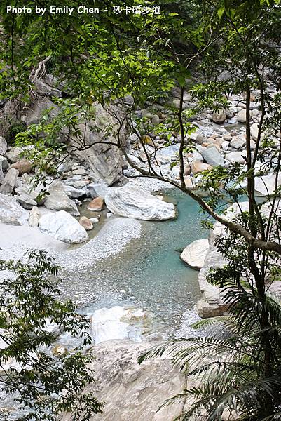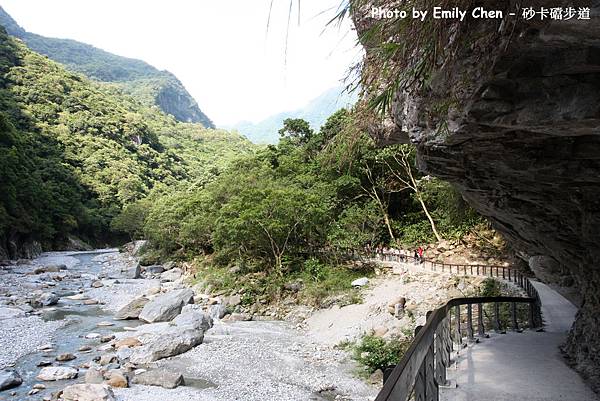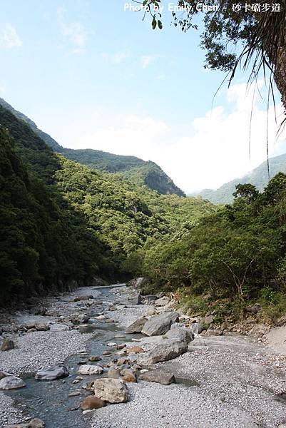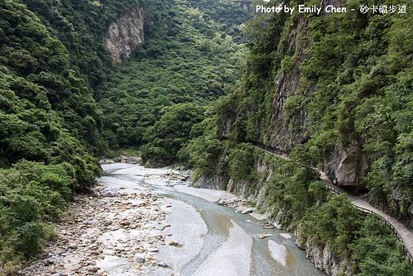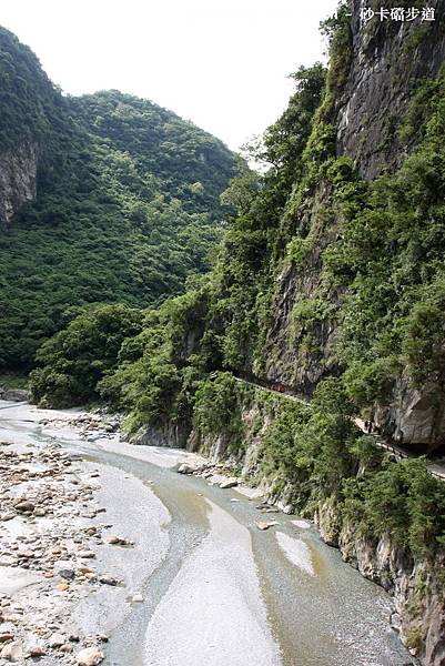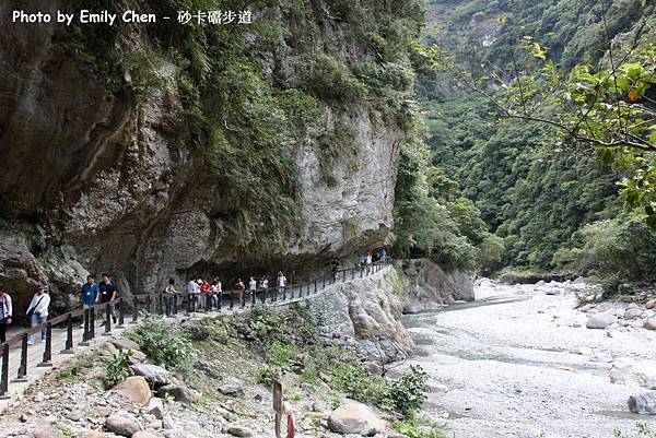 『砂卡礑步道』-砂卡礑步道原名神秘谷步道,在砂卡礑溪上游有一個太魯閣族的「大同部落」,部落舊名為「砂卡礑」(Skadang)。距步道入口約2公里處的五間屋,舊名為「斯維奇」(Swiji),太魯閣語「斯維奇」(Swiji)是指大型葉片的榕樹。砂卡礑步道走到盡頭的「三間屋」,曾是太魯閣族人的聚落,太魯閣族人稱為「柏拉耀」(Brayaw),是「姑婆芋」的意思。砂卡礑步道從入口處到三間屋全長約4.5公里,倚傍著砂卡礑溪而行。砂卡礑溪十六公里的流路中,形成峻秀的峽谷,清澈的溪水、美麗的岩石褶皺及蓊鬱的森林;步道沿途過去曾有多個原住民聚落,讓砂卡礑步道兼具景觀生態與人文之美。砂卡礑溪溪床上鋪滿大大小小的壘石,以大理石與片麻岩最多,湛藍湍急的溪水滑過溪床,與溪石合奏出清亮的自然樂音,而溪水也將岩石琢磨得圓滑柔美。褶皺在兩岸山壁和溪中岩石上形成一幅幅抽象壁畫,任人欣賞想像。(出自於太魯閣國家公園官網)